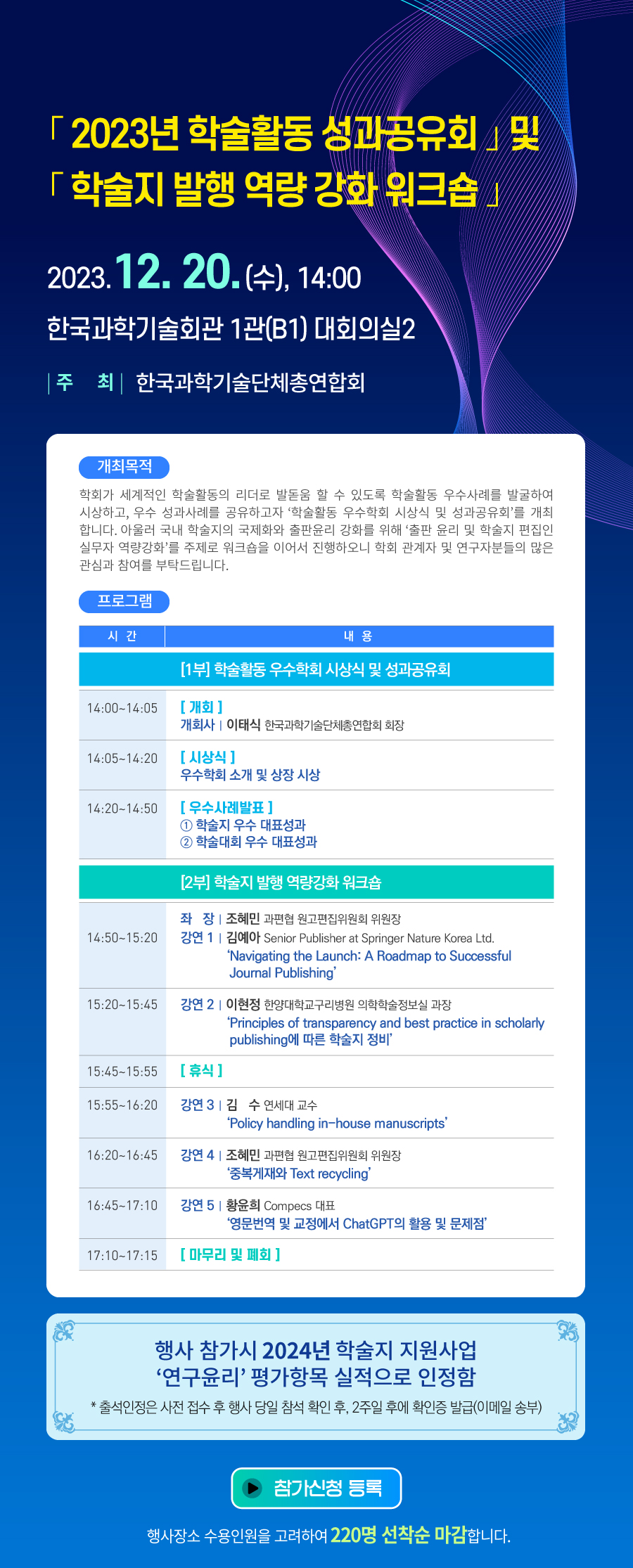 [과총] 2023년 학술활동 우수학회 성과공유회 및 학술지 발행 역량강화 워크숍 사전신청 안내 (행사일: 12월 20일)