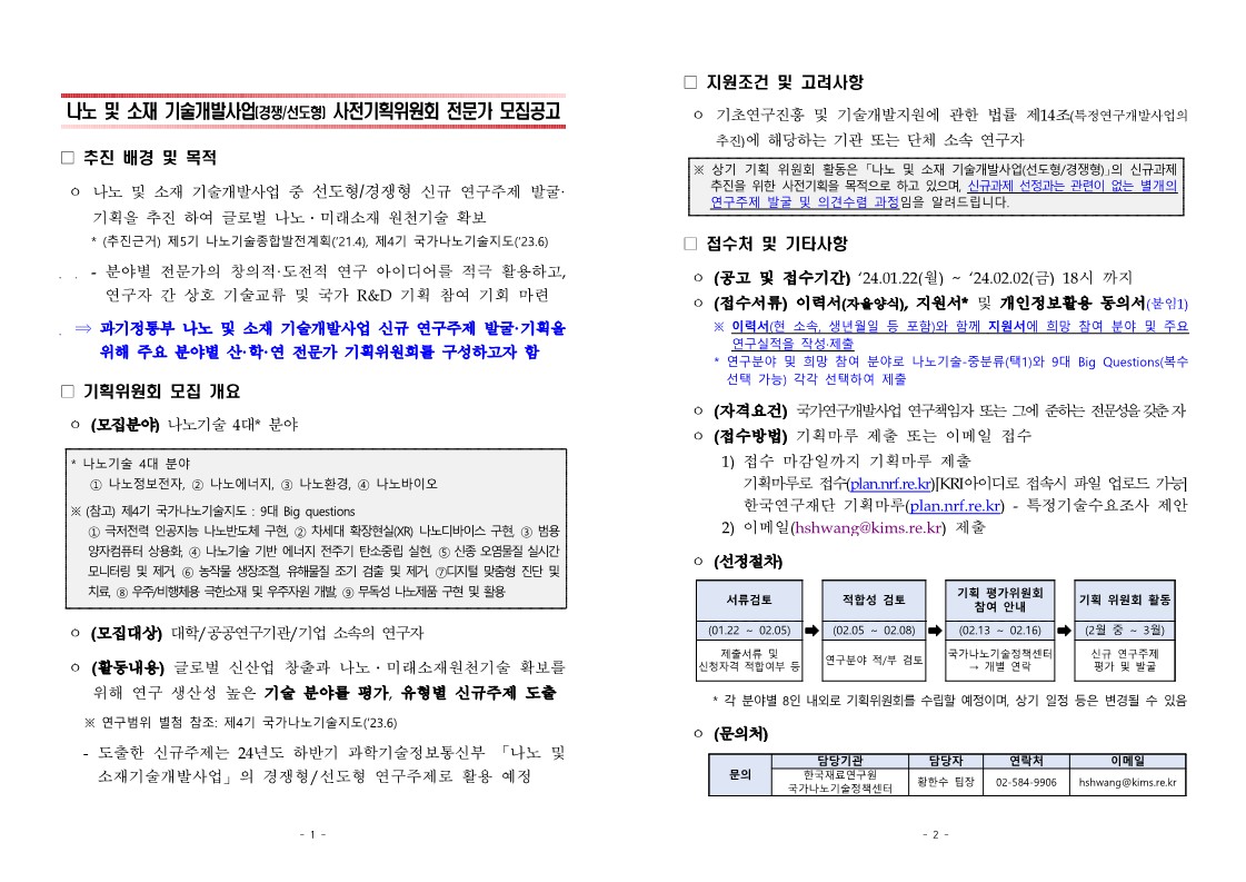 [국가나노기술정책센터] 나노미래원천기술개발(선도형/경쟁형)의 신규 연구주제 발굴을 위한 사전기획위원회 전문가 모집 (마감일: 2월 2일)