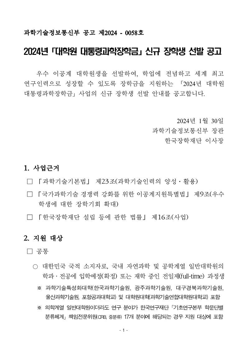 [과학기술정보통신부] 2024년「대학원 대통령과학장학금」 신규 장학생 선발 공고 (마감일: 2월 26일)