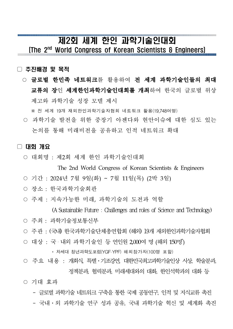 [과총] 제2회 세계한인과학기술인대회 국내역할자 후보자 추천공고 (마감일: 5월 7일까지)